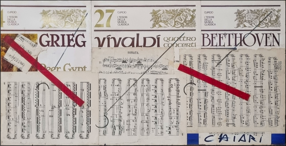 CHIARI GIUSEPPE Firenze 1926 - 2007 "Senza titolo" Tecnica mista e collage applicato su tavola cm 80x40. Firmata sul fronte in basso a destra. Al verso firma su pezzo di spartito.