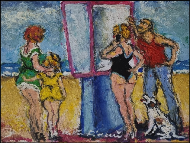 PIACESI WALTER Ascoli Piceno 1929 - Fermignano 2022 "Telefono all'aperto" Olio su tavola cm 24x18 del 2016. Firmato sul fronte in basso al centro. Al retro titolo, data, tecnica e misure.