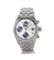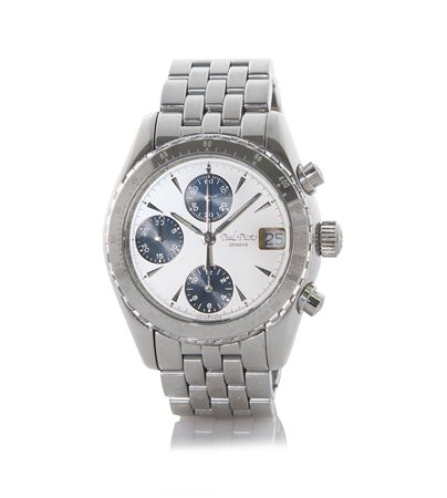 Cassa in acciaio con corona a vite, pulsanti tondi, lunetta con scala tachimetrica e vetro zaffiro. Quadrante bicolore argentato e blu con indici applicati, lancette luminescenti, contatore a 30 minuti e 12 ore, scala medicale periferica e data al 3. Movimento a carica automatica. Bracciale in acciaio con chiusura a scomparsa. Quadrante, cassa, movimento e bracciale firmati.
