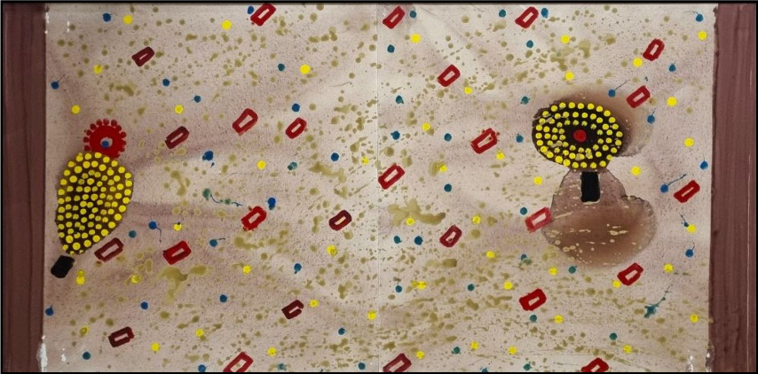 BIGGI GASTONE Roma 1925 - Langhirano 2014 "Puntocromie - I due idoli" Dittico, pittura industriale su tela, n. 2 tele accoppiate cm 70x70, totale cm 140x70 del 2009. Al verso titolo, data, firma, numero d'archivio e firma su entrambi i telai. Archivio su foto a cura del Maestro.