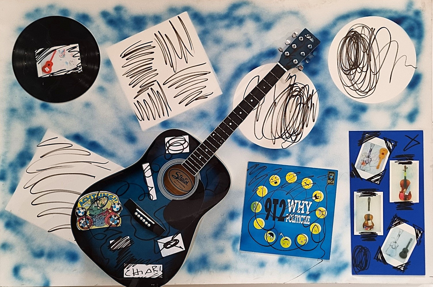 CHIARI GIUSEPPE Firenze 1926 - 2007 "Chitarra" Acrilici, chitarra, disco e collage applicati su tela cm 150x100 del 2007. Firmata sul fronte a sinistra. Autentica su foto a cura del Maestro. Opera pubblicata a pag. 41 del catalogo "Chiari - Suonare il mondo". Catalogo a corredo.