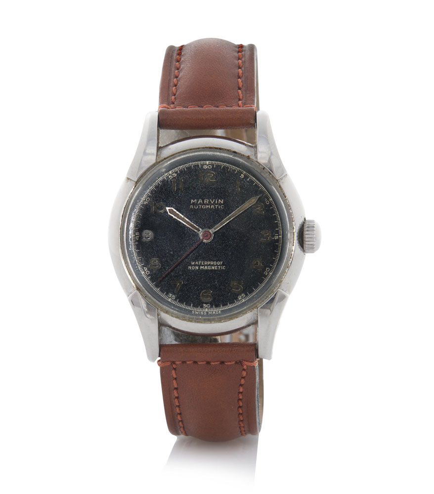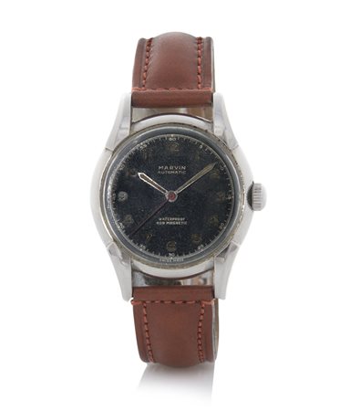 Cassa n. 43057 in acciaio con anse curve e fondello a vite. Quadrante nero con numeri arabi e lancette luminescenti. Movimento a carica automatica con rotore a martello. Quadrante, cassa e movimento firmati.