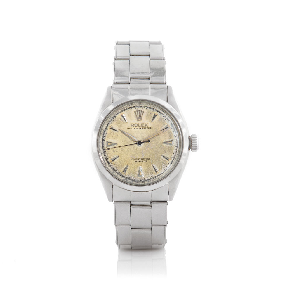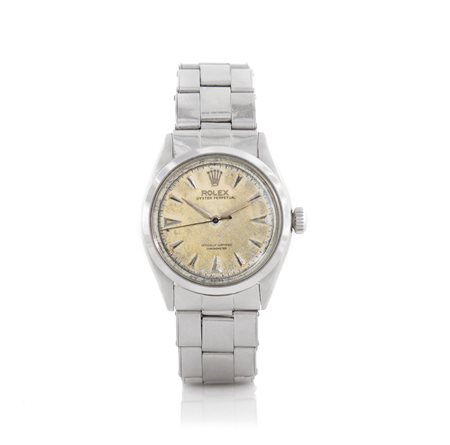 Cassa n. 935969 in acciaio con fondello e corona a vite. Quadrante argentato con indici applicati e secondi al centro. Movimento a carica automatica. Bracciale Oyster in acciaio a maglie estensibili. Quadrante, cassa, movimento e bracciale firmati.