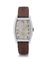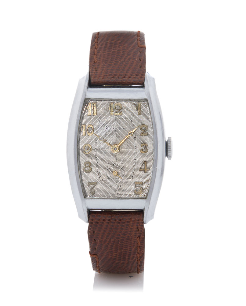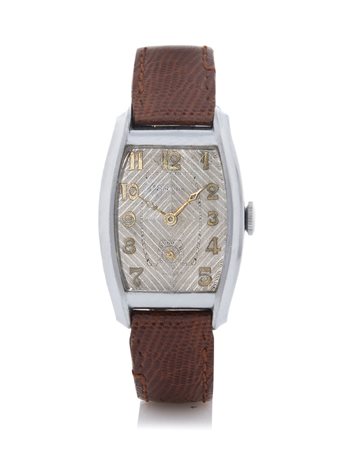 Cassa tonneau in metallo cromato. Quadrante argentato con numeri arabi applicati e secondi al 6. Movimento a carica manuale, 8 giorni.