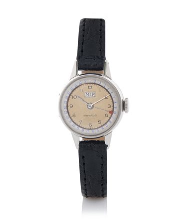 Cassa in acciaio. Quadrante a tre colori champagne, argentato e ramato con numeri arabi smaltati, finestrella per giorno al 12 e data periferica. Quadrante, cassa e movimento firmati. Completo di fibbia originale in acciaio.