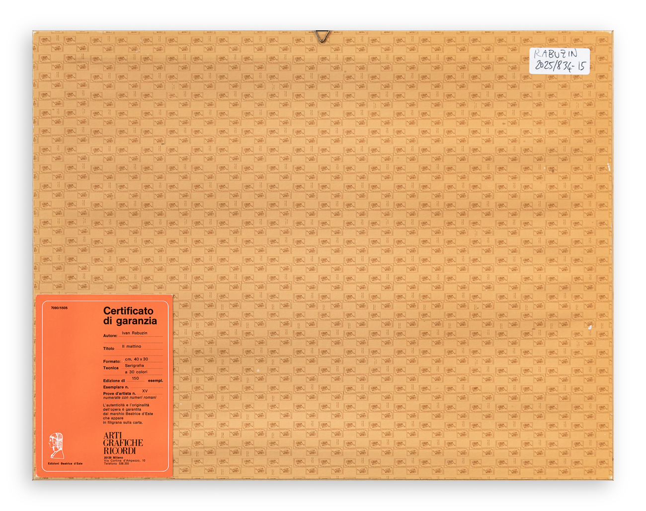 Certificato di garanzia a cura delle Arti Grafiche Ricordi (MI) applicato al retro del cartoncino protettivo