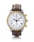Cassa in acciaio con fondello a vite, pulsanti tondi, lunetta dorata con scala telemetrica smaltata, vetro zaffiro. Quadrante bianco con numeri romani smaltati, contatore a 30 minuti e 12 ore, data al 3. Movimento a carica automatica. Quadrante, cassa e movimento firmati. Completo di fibbia originale.