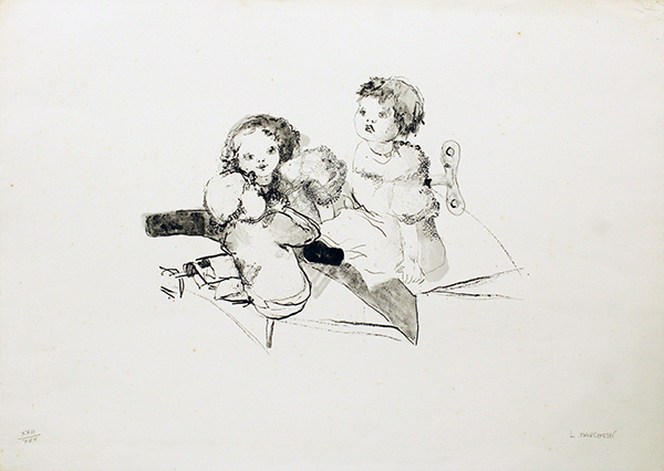 LEONELLA MARCHETTI, "Bambole", anni 80, litografia su cartoncino, cm 50x70. Al fronte: tiratura in basso a sinistra, esemplare XXII/XXX e firma in basso a destra. L'opera presenta leggerissima fioritura. Opera senza cornice.