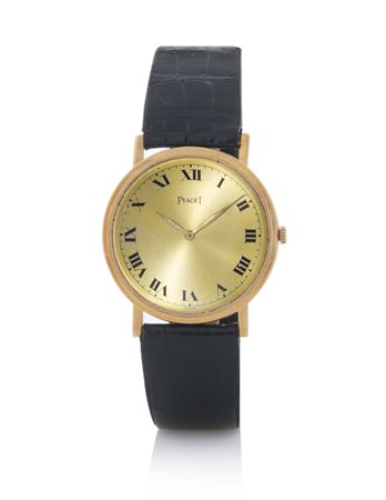 Cassa n. 164978 in oro giallo 18 kt con fondello chiuso da viti e vetro zaffiro. Quadrante champagne con numeri romani smaltati. Movimento a carica manuale. Quadrante, cassa e movimento firmati. Completo di fibbia originale in oro giallo 18 kt.