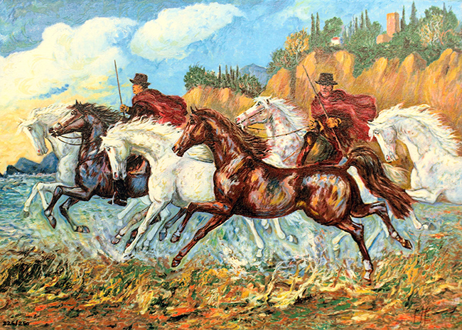 GIOVAN FRANCESCO GONZAGA, "Buttieri sul mare", anni '90, serigrafia su tela, cm 50x70. Al fronte: tiratura in basso a sinistra, esemplare 226/250 e firma in basso a destra. Al verso: timbro. Opera con certificato di provenienza della Daliano Ribani Arte. Opera senza cornice.