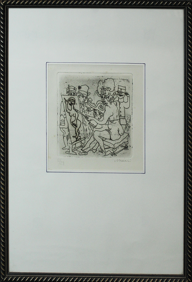 MINO MACCARI, "Pittrice", anni '80, incisione su cartoncino, misura incisione cm 20x19, misura del foglio 50x36, misura con cornice 54x39x2, peso 2 kg, esemplare 12/28. Al fronte: tiratura in basso a sinistra e firma in basso a destra. Opera con cornice. Presenta quasi impercettibile fioritura.