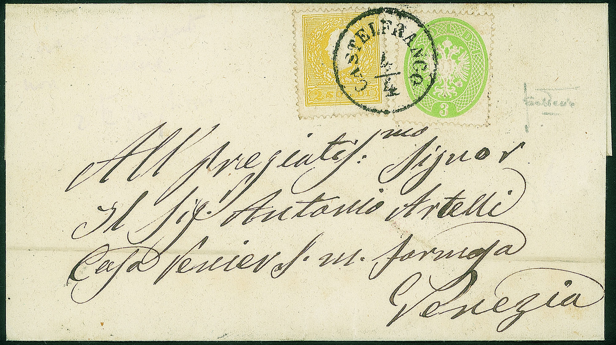 Antichi Stati Italiani - Lombardo Veneto - Lettera affrancata con 2 soldi secondo tipo (28) più 3 soldi (37)Ben dentellati - Castelfranco 4.4.64 - uso tardivo del 2 soldi (grinza d'applicazione) - rara mista - cert. Sottoriva