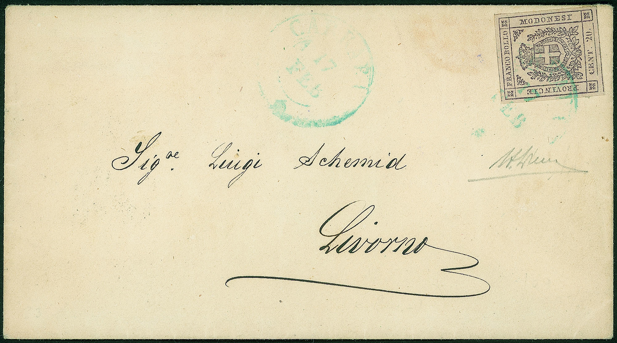 Antichi Stati Italiani - Modena - Lettera da Carrara (p. 8) per Livorno 17.2.1860Uso tardo - con 20 cent. lilla grigio chiaro (Sass. 16), Splendida
