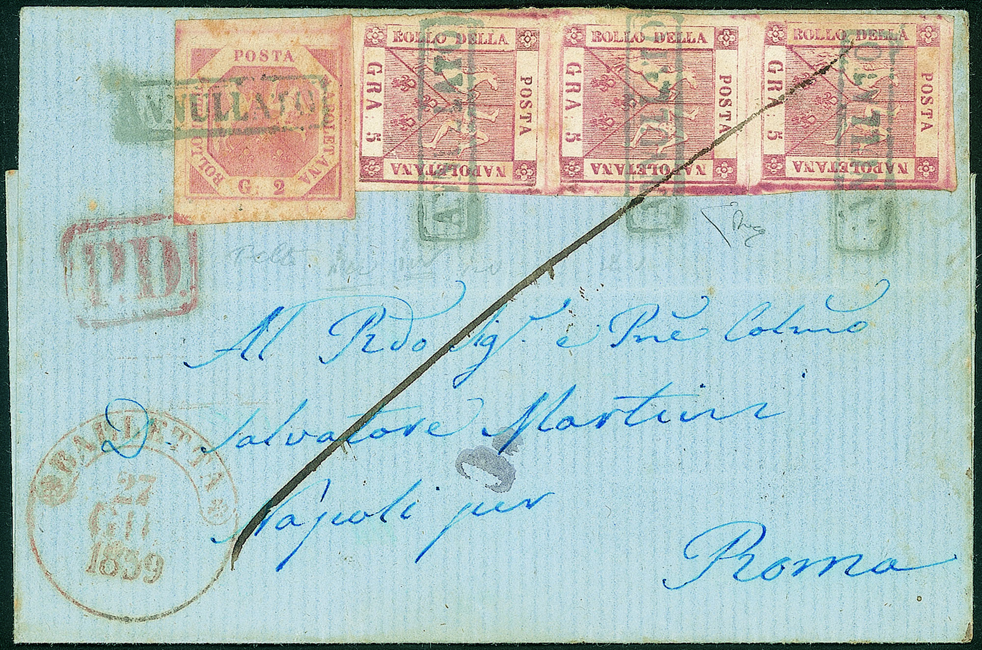 Lotto 42 | Antichi Stati Italiani - Napoli - Lettera con striscia di tre del 5 grana + esemplare 2 grana (8+7)