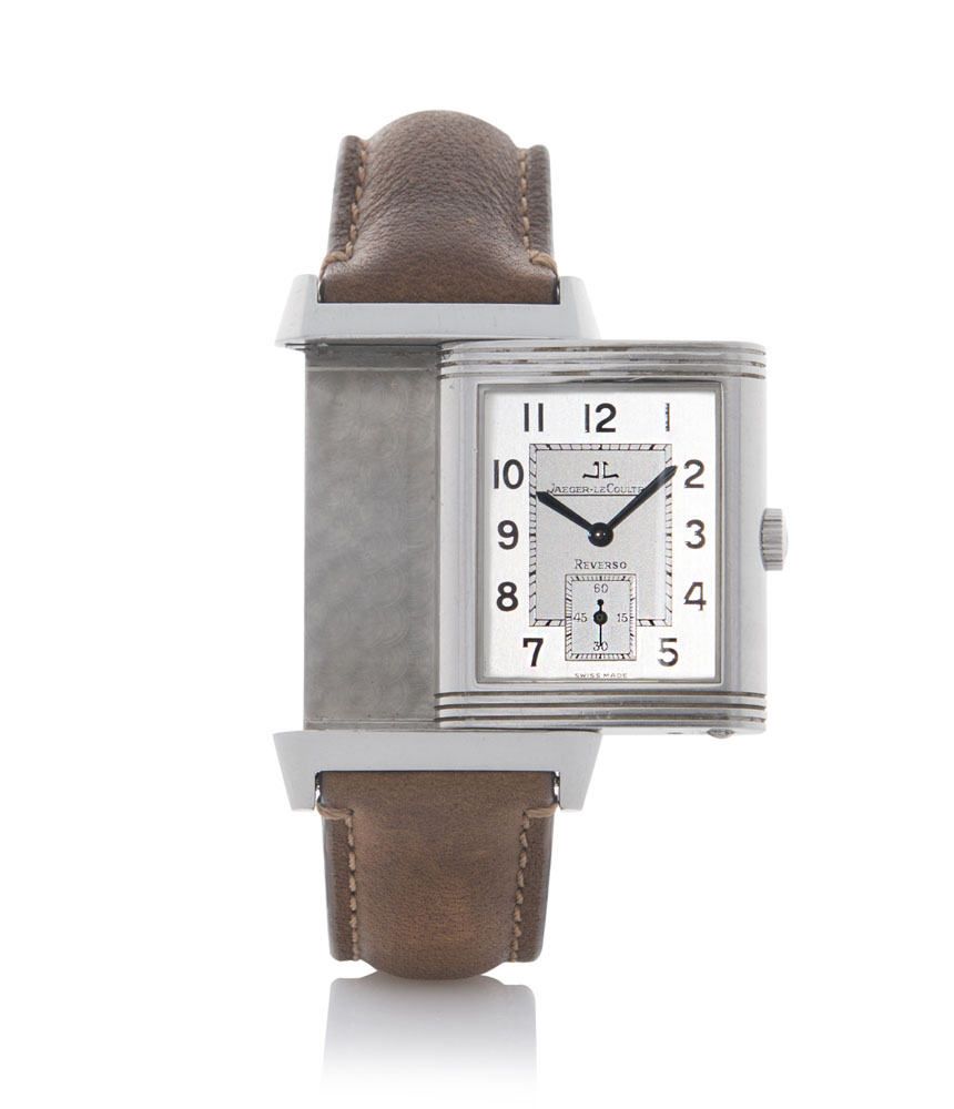 Cassa n. 1708346 reversibile in acciaio con vetro zaffiro. Quadrante argentato a due toni con numeri arabi smaltati e secondi al 6. Movimento a carica manuale. Quadrante, cassa e movimento firmati.