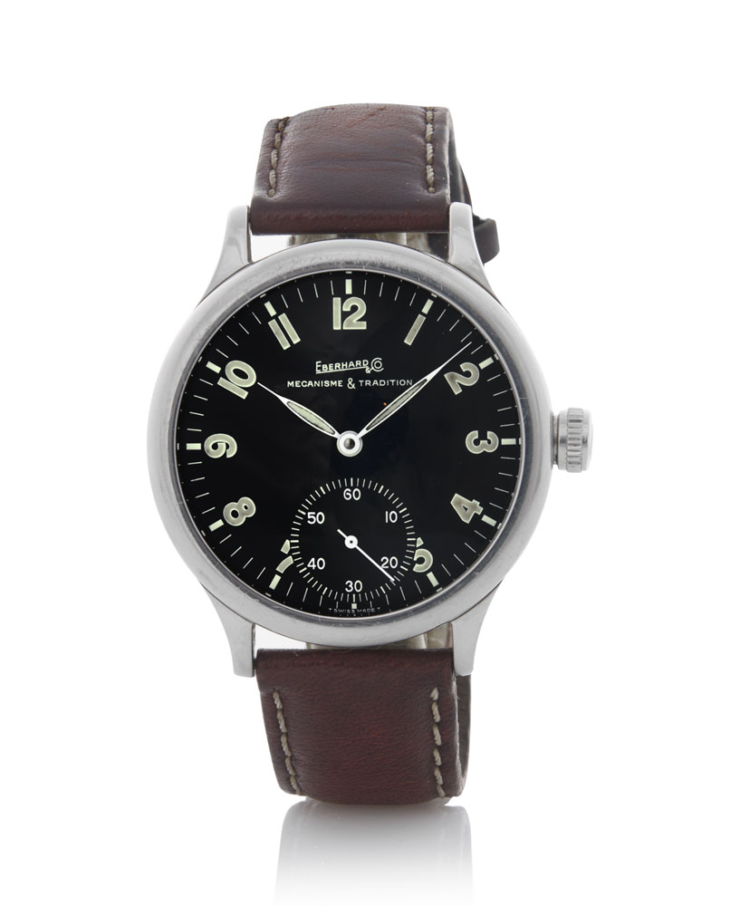 Cassa in acciaio con fondello chiuso da viti, vetro zaffiro. Quadrante nero con numeri arabi e lancette luminescenti, secondi al 6. Movimento a carica manuale. Quadrante, cassa e movimento firmati.