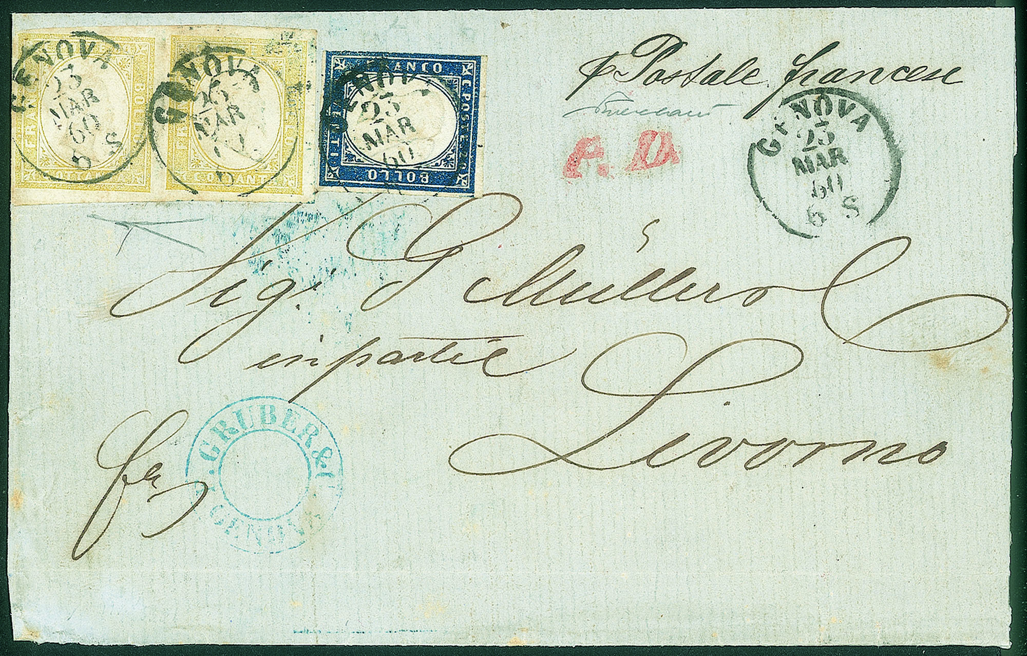 Antichi Stati Italiani - Sardegna - Lettera via di Mare coi postali Francesi da GENOVA 23 MAR.60Per Livorno in tariffa da sei porti affrancata con c.20 azzurro + coppia c.80 giallo limone, molto rara, relazione storico postale M.Mentaschi