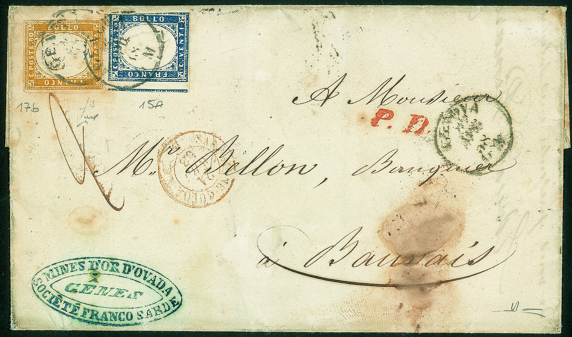 Antichi Stati Italiani - Sardegna - Lettera affrancata con 20 cent azzurro grigiastro (15A) + 80 cent ocra arancio (17b)Da Genova a Beauvais del '21'.4.58 - raro insieme - cert. Manzoni