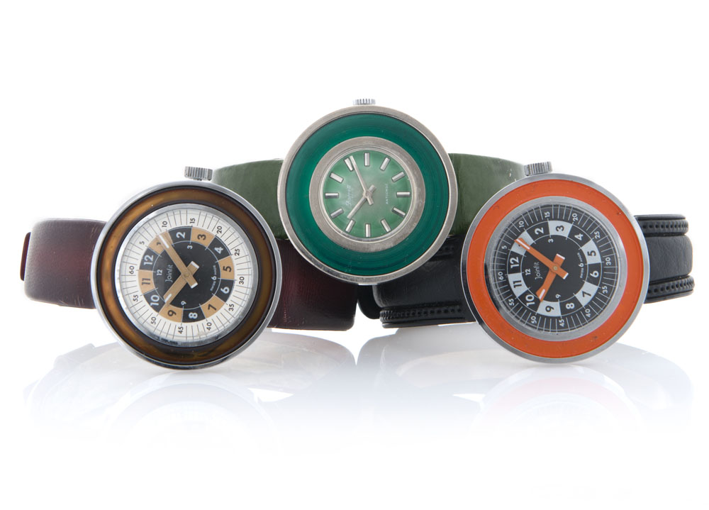 1. Cassa in acciaio con lunetta smaltata verde. Quadrante verde sfumato con indici applicati. Completo di cinturino e fibbia in acciaio originali. 2. Cassa in acciaio con lunetta smaltata arancione. Quadrante bicolore bianco-nero con numeri arabi smaltati e lancette arancioni. 3. Cassa in acciaio con lunetta smaltata marrone. Quadrante bianco-nero e dorato con numeri arabi smaltati e lancette dorate. Movimenti a carica manuale. Quadranti firmati.