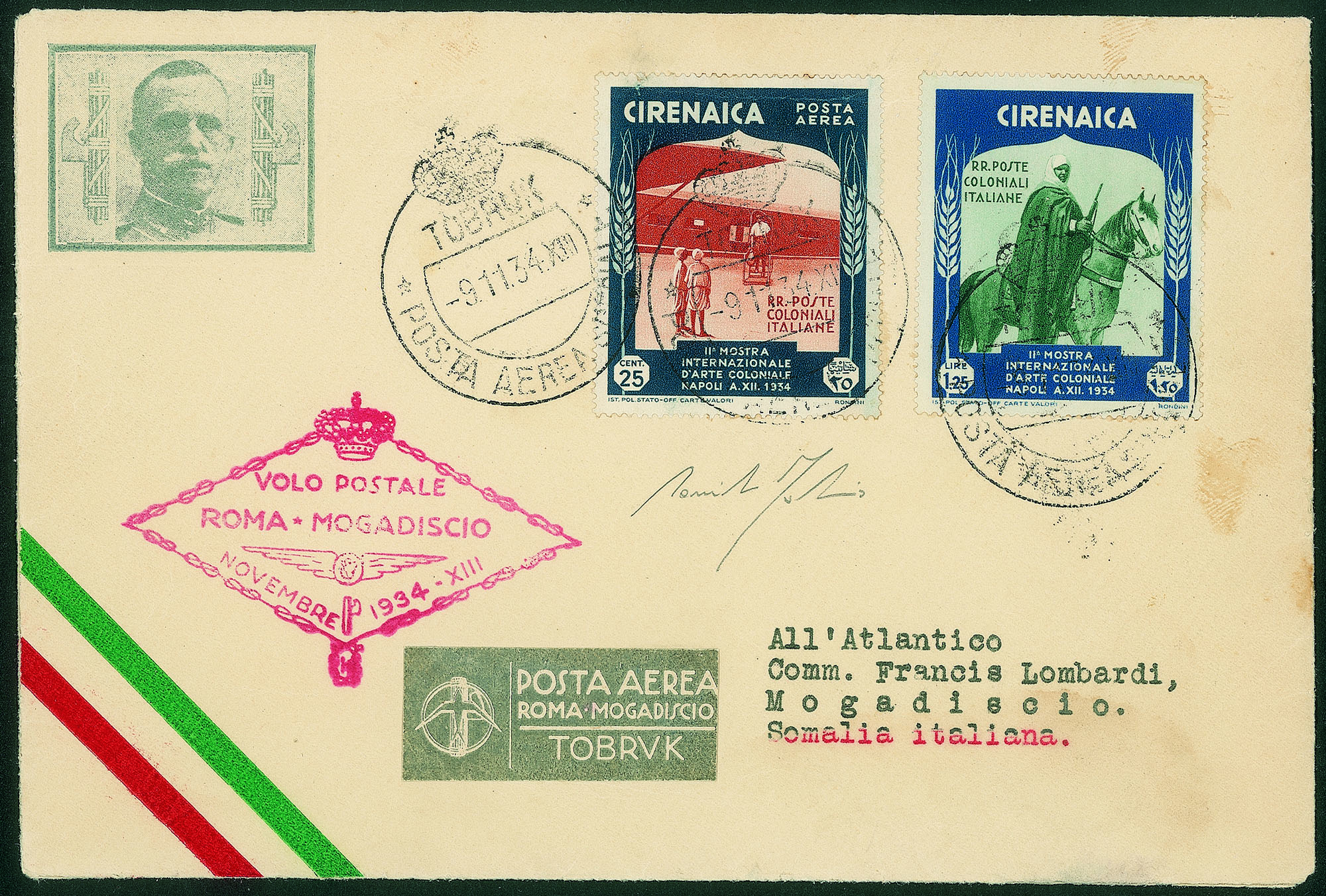 Regno - Vittorio Emanuele III - 1934 - Volo Roma Mogadiscio - Longhi 3205Aerogramma del volo speciale delle tappa Tobruk Mogadiscio del 9.11.34 - cert Fabris