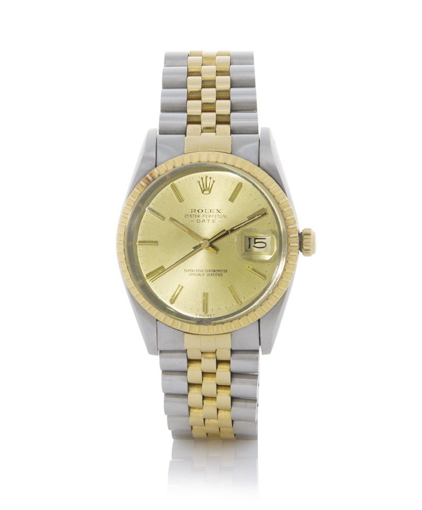 ROLEX OYSTER PERPETUAL DATE REF. 15053 DEL 1984 CA. Cassa n. 8516419 in acciaio e oro giallo 18 kt con fondello e corona a vite, lunetta godronata. Quadrante champagne con indici applicati, secondi al centro e data al 3. Movimento a carica automatica. Bracciale Jubilè in acciaio e oro giallo 18 kt. Quadrante, cassa, movimento e bracciale firmati.
