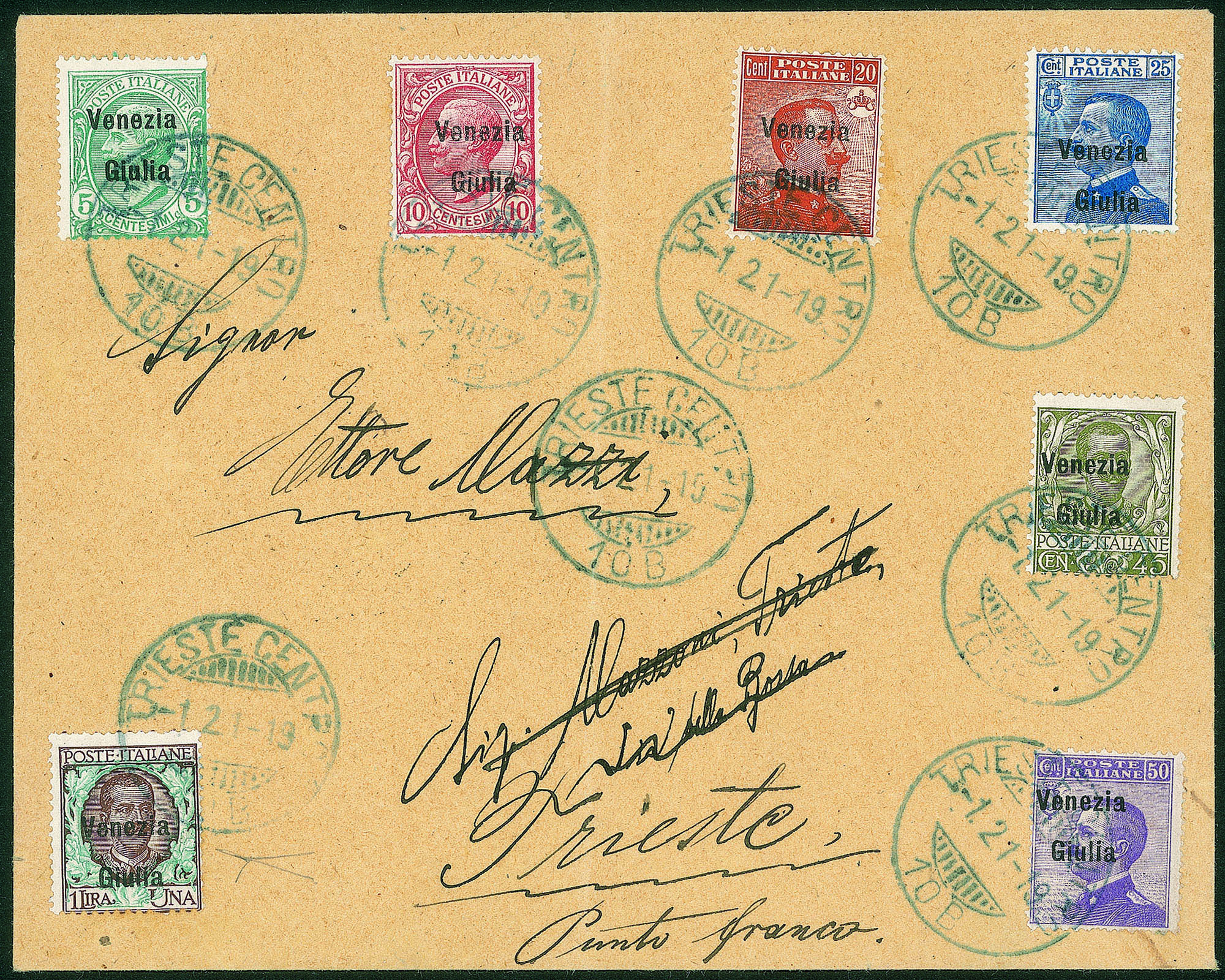 Occupazioni I guerra mondiale - Busta affrancata con valori di Floreale Leoni e Michetti (21/24 + 26/27 + 29)Trieste 21.1.19 - Bottacchi