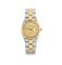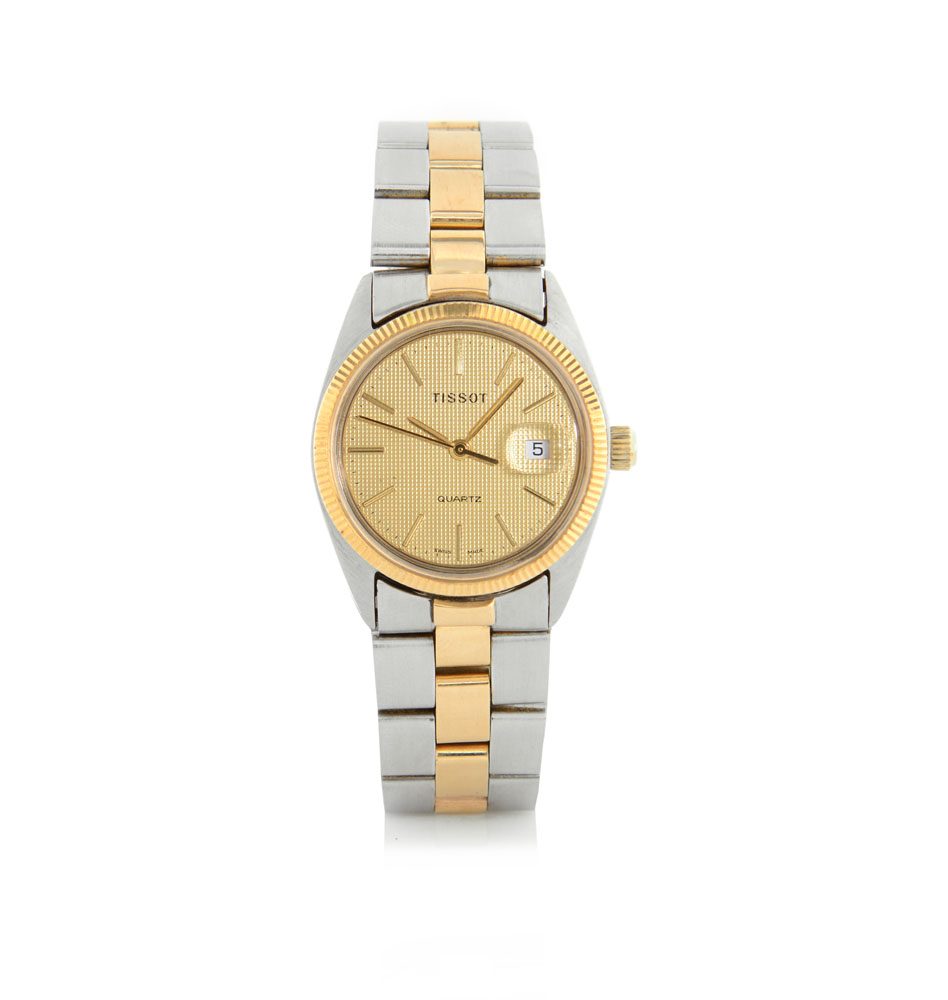 TISSOT ANNI '80. Cassa in acciaio e oro giallo 18 kt con fondello e corona a vite, lunetta godronata. Quadrante guillochè champagne con indici applicati, secondi al centro e data al 3. Movimento al quarzo. Bracciale in acciaio e oro giallo 18 kt. Quadrante, cassa, movimento e bracciale firmati.