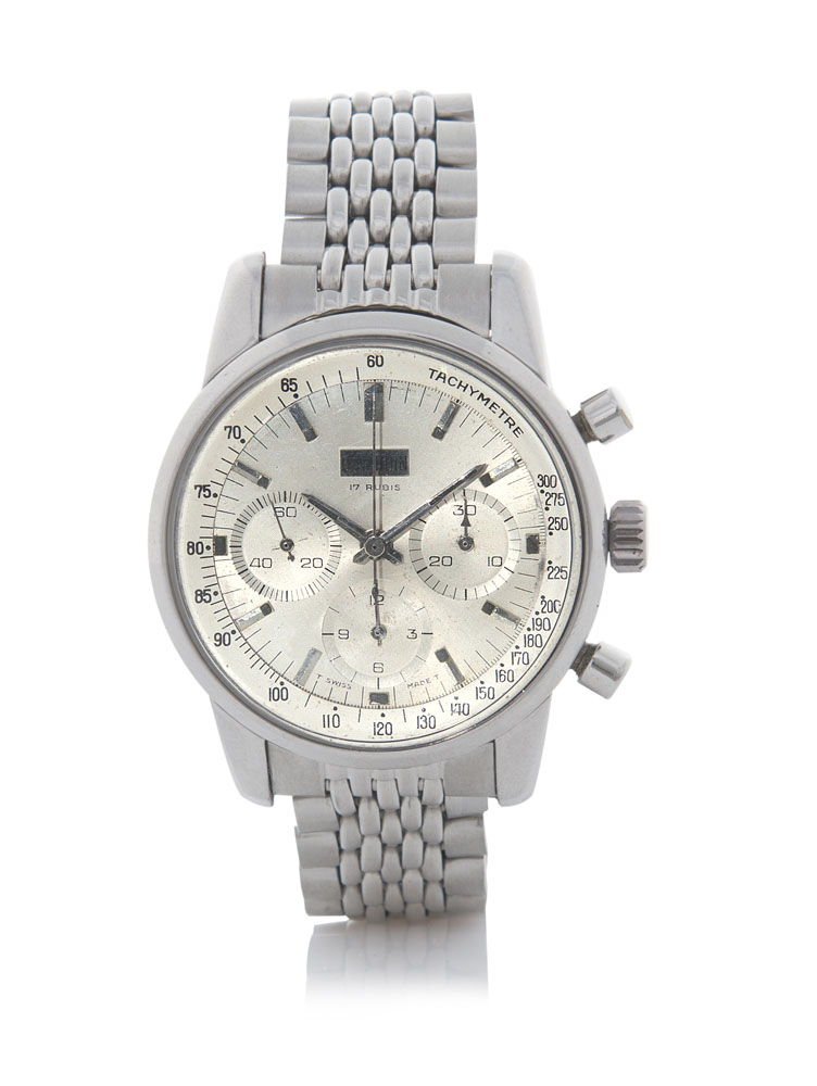 Cassa in acciaio con fondello a vite e pulsanti tondi. Quadrante argentato con indici applicati, contatore a 30 minuti e 12 ore, scala tachimetrica periferica. Movimento a carica manuale. Bracciale in acciaio. Quadrante, cassa e movimento firmati.