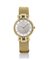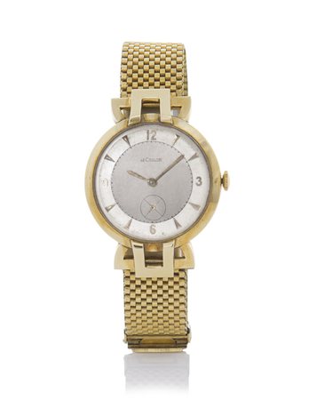 Cassa n. 83678 laminata in oro giallo con anse di fantasia. Quadrante bicolore argentato e bianco con indici e numeri arabi applicati, secondi al 6. Movimento a carica manuale. Bracciale in metallo dorato. Quadrante, cassa e movimento firmati.