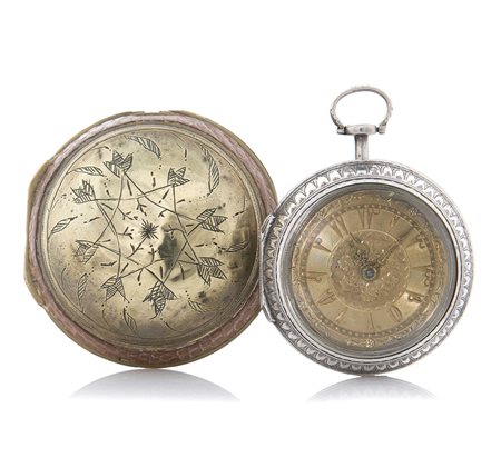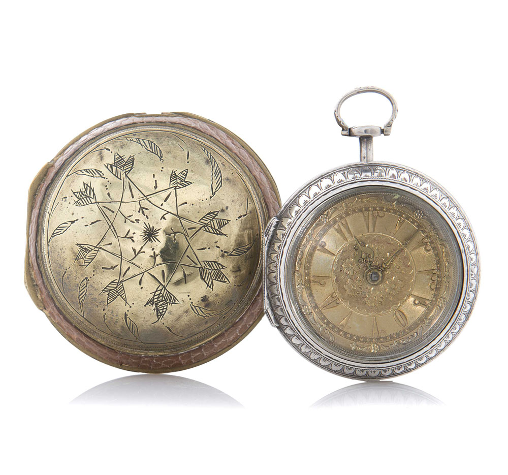 Cassa in argento liscia entro copricassa in argento interamente inciso con trofeo di strumenti musicali al centro. Terza cassa da viaggio in metallo ed ottone con incisioni sul fronte, profilo e retro rivestiti in pelle. Quadrante in argento dorato con decori ed indici turchi a rilievo. Movimento firmato con scappamento a verga, carica a chiavetta.