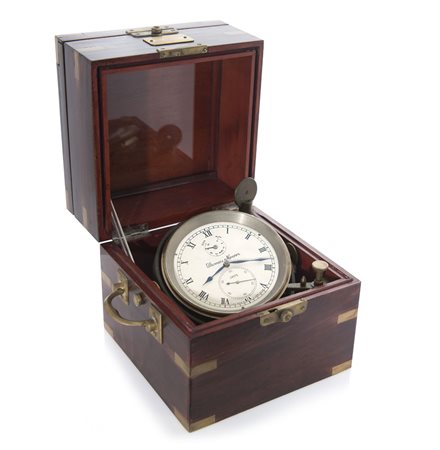 Cassa circolare in ottone dorato, basculante entro cassa in legno. Quadrante argentato con numeri romani smaltati, secondi al 6 e riserva di carica. 56 ore, al 12. Movimento con scappamento De Tent.
