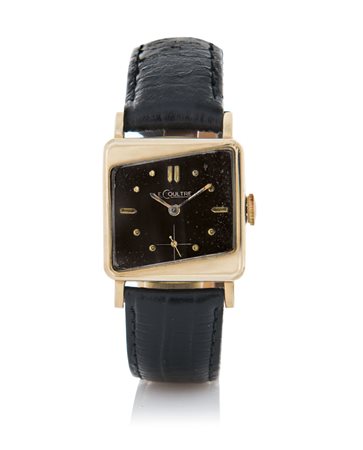Cassa n. 391243 asimmetrica laminata in oro giallo 10 kt con anse curve. Quadrante nero con indici applicati e secondi al 6. Movimento a carica manuale. Quadrante, cassa e movimento firmati.