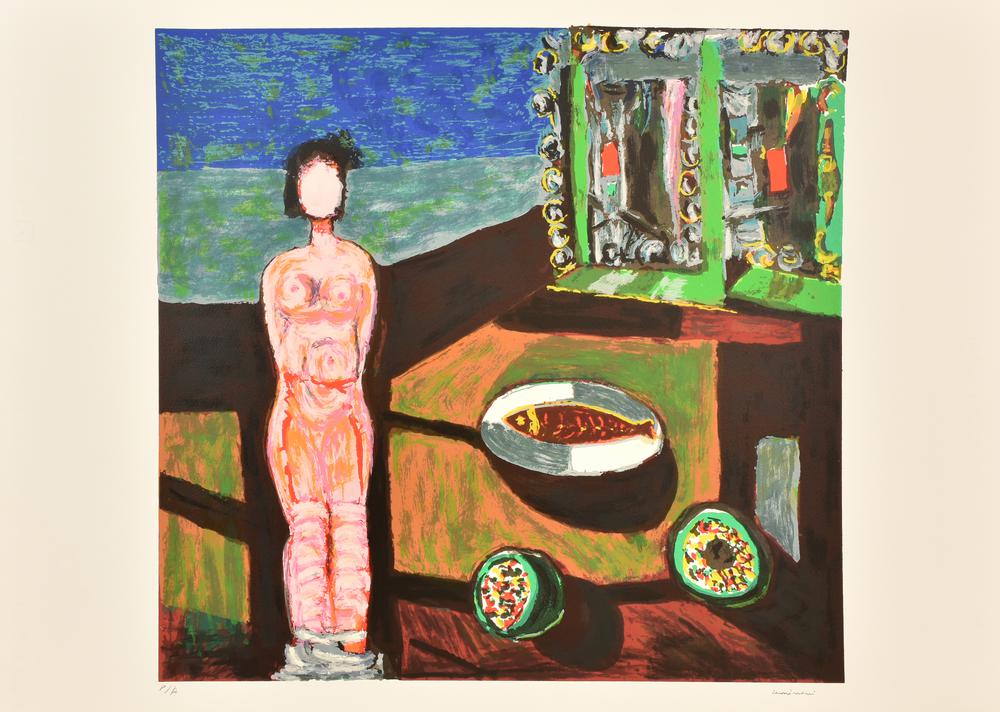 Bruno Cassinari NATURA MORTA CON NUDO serigrafia su carta Fabriano, cm 50x70;...