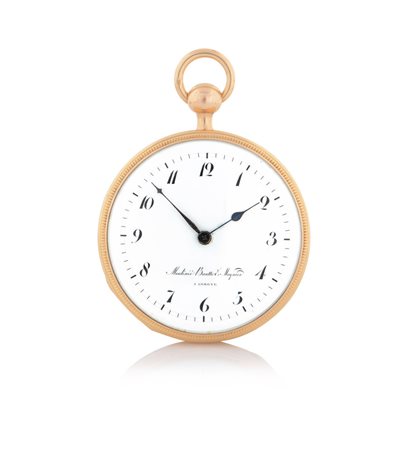 Cassa in oro rosa 18 kt incisa guilloché. Quadrante in smalto con numeri arabi. Movimento con scappamento a verga, suoneria a richiamo delle ore e dei quarti, carica a chiavetta. Quadrante, cassa e movimento firmati.