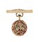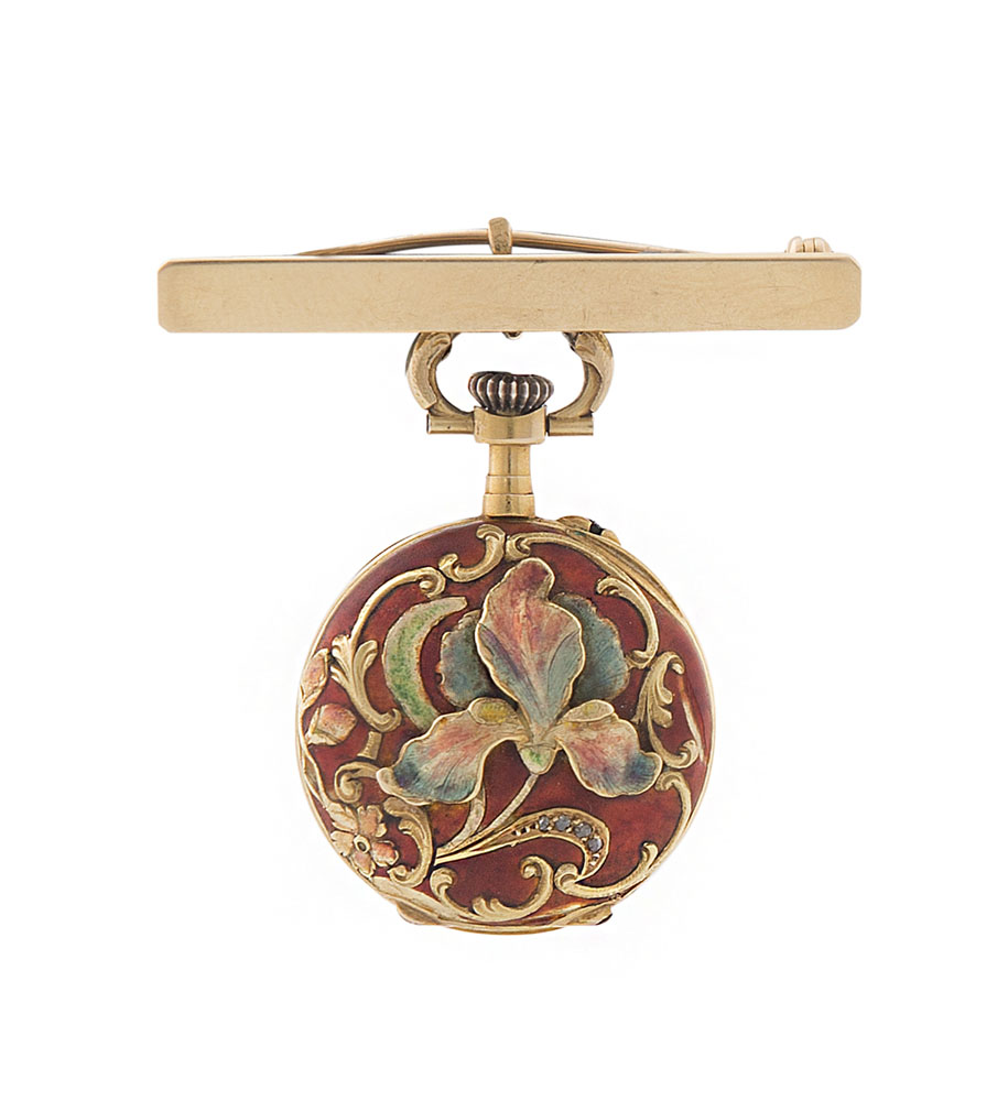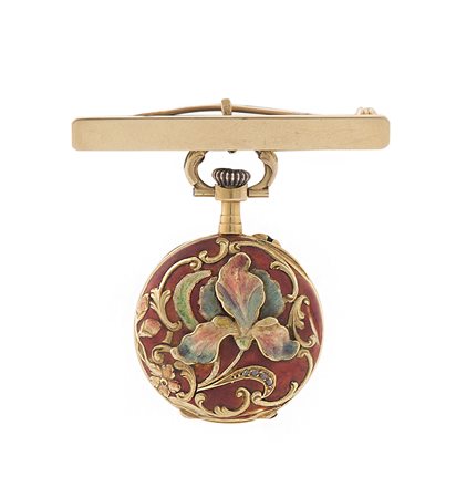 Cassa in oro giallo 18 kt con decoro floreale smaltato a rilievo al retro. Quadrante in smalto con numeri arabi, indici applicati. Movimento con scappamento ad ancora, carica manuale. Cassa numerata, movimento firmato. Completo di spilla in oro giallo.