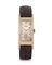 Cassa rettangolare, arcuata laminata in oro giallo. Quadrante argentato con numeri arabi applicati e secondi al 6. Movimento di forma a carica manuale. Quadrante e movimento firmati, cassa numerata.