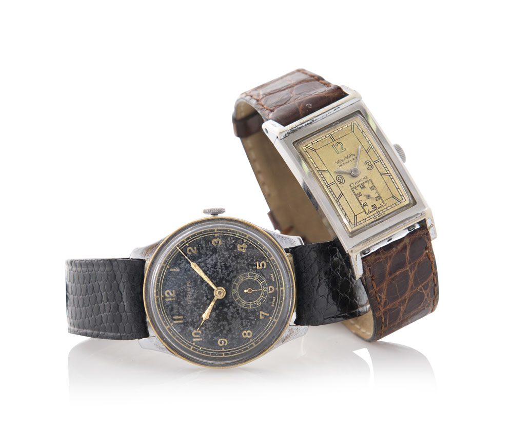1. Cassa n. 937800 rettangolare arcuata in acciaio. Quadrante champagne con numeri arabi smaltati e secondi al 6. Movimento a carica manuale. 2. Cassa in metallo con fondello in acciaio e anse fisse. Quadrante nero con numeri arabi smaltati e secondi al 6. Movimento a carica manuale. Quadrante firmato.