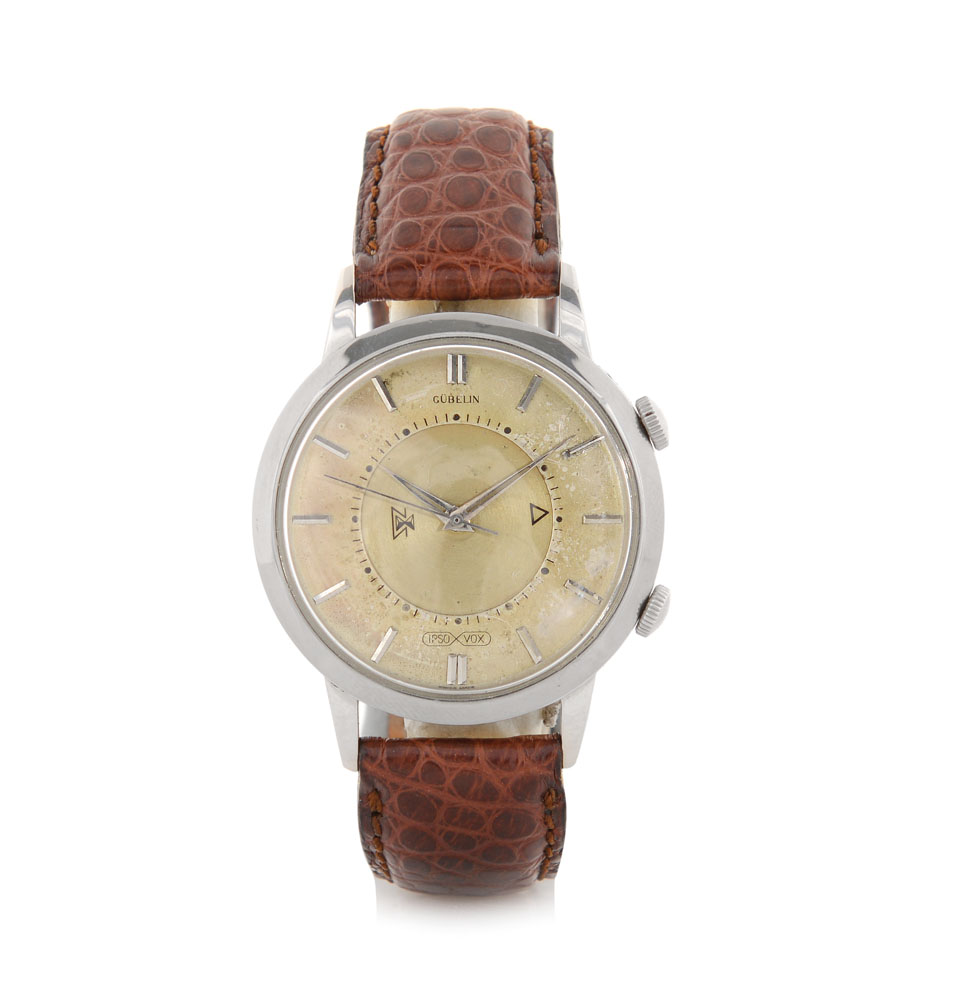 JAEGER LE COULTRE PER GUBELIN IPSO VOX ANNI '50. Cassa in acciaio con fondello a vite, monogramma inciso, due corone al 2 e 4. Quadrante argentato con indici applicati, secondi e disco per la sveglia al centro. Movimento a carica automatica con rotore a martello. Quadrante firmato Gubelin, movimento Jaeger Le Coultre, cassa Jaeger Le Coultre-Gubelin.