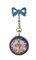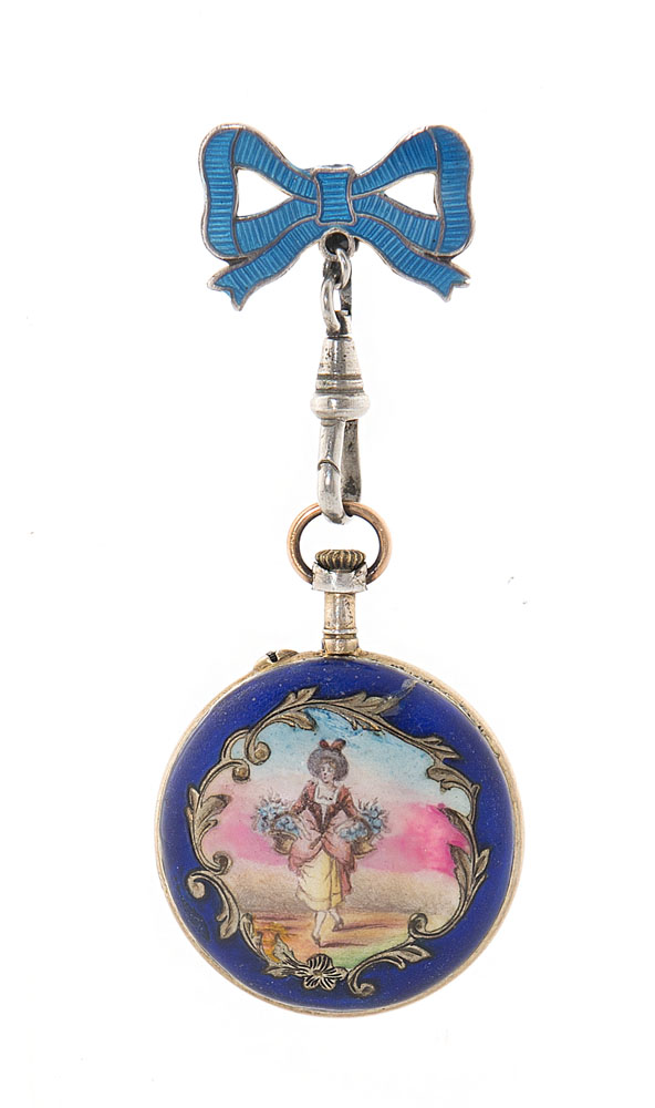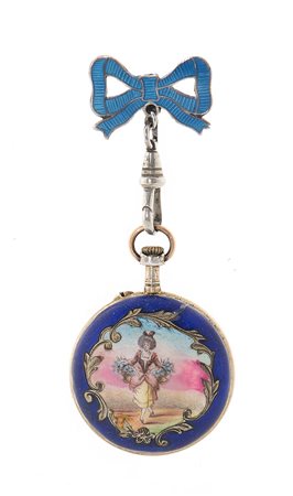 Cassa in argento smaltato blu con miniatura al retro. Quadrante in smalto con numeri arabi. Movimento con scappamento ad ancora, carica manuale. Completo di spilla a fiocco in argento e smalto azzurro.