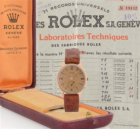 Cassa n. 38516 a moneta in oro rosa 18 kt (ottimo). Quadrante rosa con indici e numeri romani applicati, secondi al 6 (originale, lievemente puntinato, buono). Movimento a carica manuale (buono). Quadrante, cassa e movimento firmati. Completo di fibbia originale, astuccio e certificato del 06/1941.