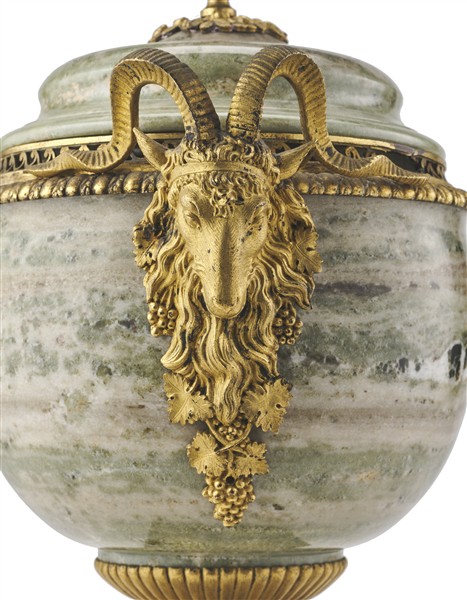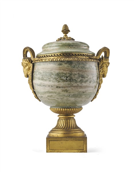 Bruciaprofumo biansato con coperchio in marmo verde svedese con applicazioni in bronzo dorato. Il corpo emisferico poggia su una base a balaustro scanalata con decoro floreale su sostegno quadrato. Anse a testa di caprone con corna a spirale e barba fluente da cui pendono grappoli d'uva. Fascia traforata a ovuli e palmette. Presa del coperchio a pigna a tutto tondo. Secolo XIX (h. cm 33) (difetti e rotture)