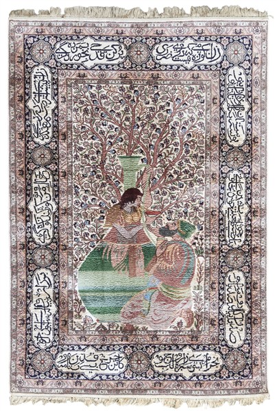Tappeto Tabriz, Persia, secolo XX. Annodato in seta su seta. Decoro figurato raffigurante probabilmente Layla e Majnun seduti sotto un albero, protagonisti di una leggenda amorosa tipica della tradizione mediorientale. Bordura con iscrizioni persiane (probabilmente in nastiliq) entro cartigli tra motivi floreali (cm 220x153) (lievi difetti)