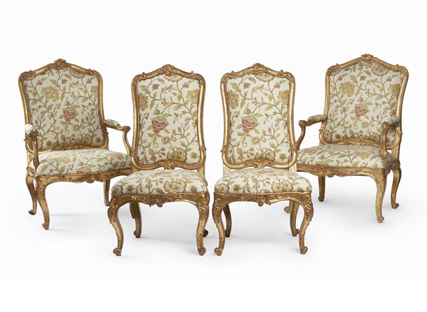 Set consisting of two chairs and two armchairs in carved and gilded wood with a wavy shape with decoration of leafy scrolls and cartouches. Seat and backrest covered in polychrome fabric with floral decoration. Piedmont, 18th century (defects and restorations)
