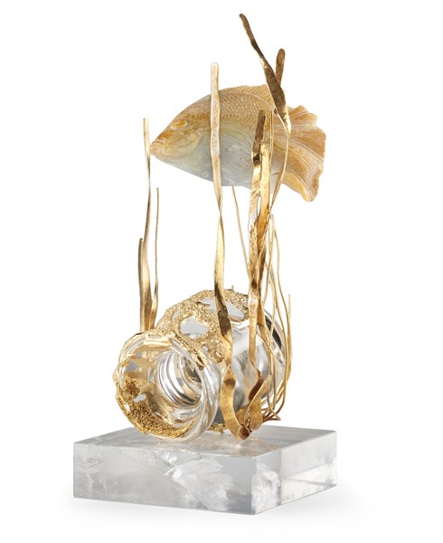 Workers of the Opificio Orafo Torrini. Second half of the 20th century. ''Sea bed', rock crystal and gold group to simulate a seabed with amphora, algae, orange jade fish on square base (h. cm 17,5) (minor defects)