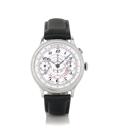Cassa n. 14332 in acciaio con pulsante ad oliva al 2. Quadrante in smalto con numeri arabi smaltati, contatore a 30 minuti, scala telemetrica periferica e tachimetrica a chiocciola. Movimento a carica manuale. Quadrante, cassa e movimento firmati. Completo di fibbia in acciaio originale.