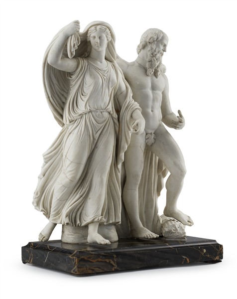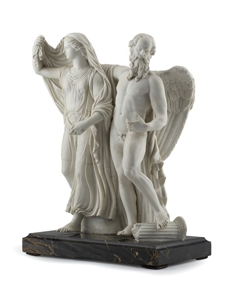 Real Fabbrica Ferdinandea, Napoli, 1790-1800, 'Il Tempo scopre la Verità' gruppo in biscuit, base in marmo portoro, 1790-1800 (h. cm 30) (difetti di cottura, piccole mancanze)