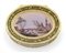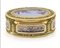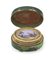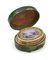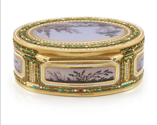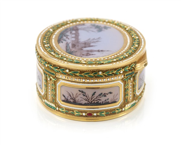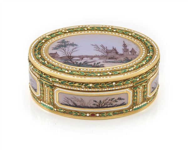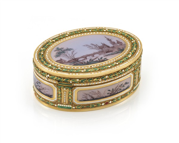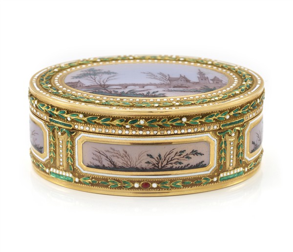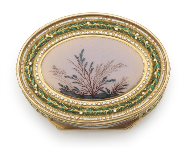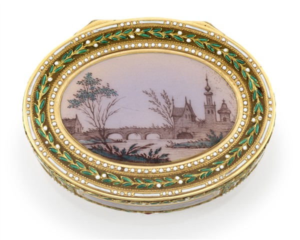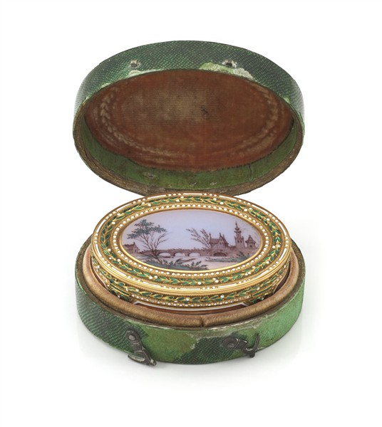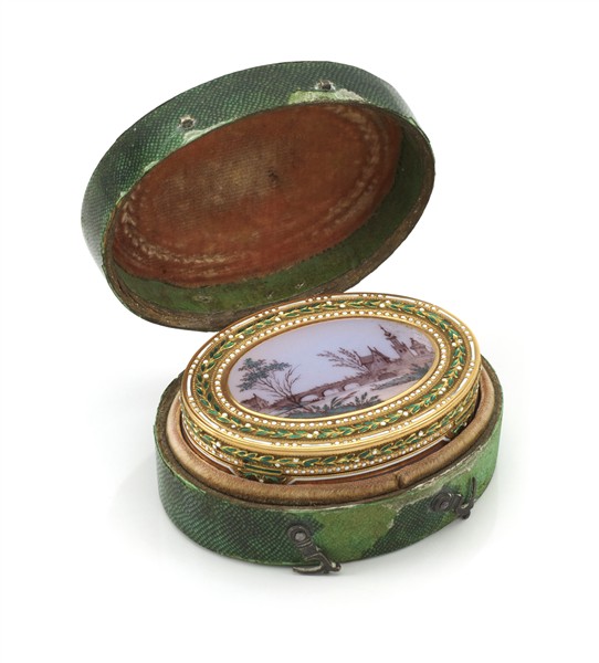 Melchior-René Bocher, Parigi, 1774. Snuff box ovale in oro giallo con fregi floreali in smalti verde e bianco a incorniciare raffinate riserve in smalto opalescente con paesaggio sul coperchio e decori floreali nella fascia e sotto la base. Marchi di carico, scarico, lettera dataria e orefice, all'interno lettera con la provenienza (cm 6,5x5x2,5) entro scatola in galuchat verde (difetti sulla custodia)