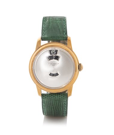 PREMIER "SALTARELLO" ANNI '60. Cassa laminata oro giallo con fondello a vite in acciaio. Quadrante argentato con finestrelle nere per ore, minuti e secondi. Movimento a carica manuale. Quadrante firmato.