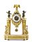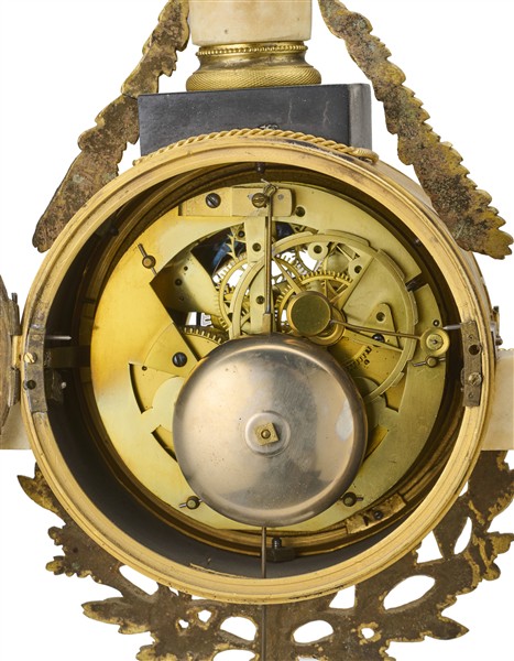 Pendola a portico in marmo bianco e bronzo dorato e patinato decorato da cariatidi e sormontata da aquila e putti a tuttotondo. Quadrante a fascia in smalto bianco a numeri romani per le ore e arabi per i minuti con calendario mensile e giorni della settimana. Movimento scheletrato a due treni con suoneria delle ore e mezze su campanello. Francia, ultimo quarto del secolo XVIII (cm 58x41,5x12) (difetti e piccole mancanze)
