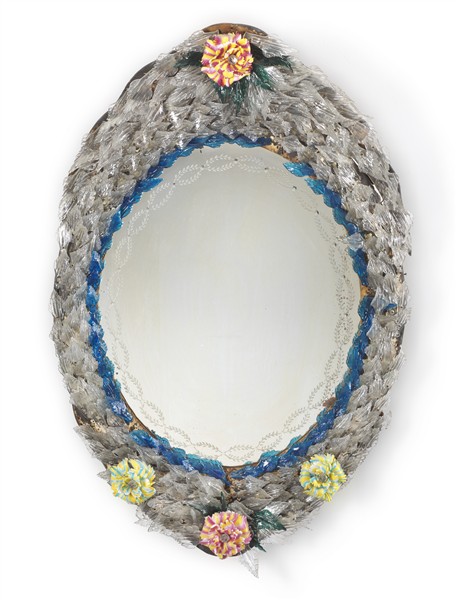 Manifattura di Murano, fine secolo XIX. Specchiera ovale modello "Primavera". La cornice con struttura in legno rivestito da foglie in vetro incolore, cornice interna con foglie in vetro blu, inserti in forma di boccioli di fiori in vetro policromo, specchio in vetro inciso a motivo fogliato concatenato (cm 80x53) (difetti e mancanze)